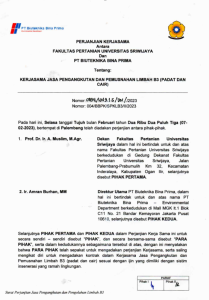 Hazardous Toxic Waste (Bahan Beracun Berbahaya, “B3”) is waste that contains toxic and hazardous substances that can interfere with health, damage the environment, and threaten the survival of humans and other organisms. In handling hazardous toxic waste, Universitas Sriwijaya (UNSRI) collaborates with PT Biuteknika Bina Prima. This cooperation activity contains a contract in cooperation for transportation services and destruction of hazardous toxic waste in the form of solid and liquid waste in accordance with the permits owned with an environmentally friendly incineration system. This cooperation is carried out in an effort to support the government in preserving the sustainability, health, and safety of the environment and humans.