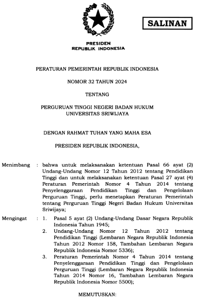 The government of the Republic of Indonesia has made regulations for Sriwijaya University in 2024 which state that state universities have legal status. These regulations discuss many things starting from the field of management and even including regulations on land use, conservation and restoration. Land use, conservation and restoration regulations can be seen in paragraph 3 of article 88.
