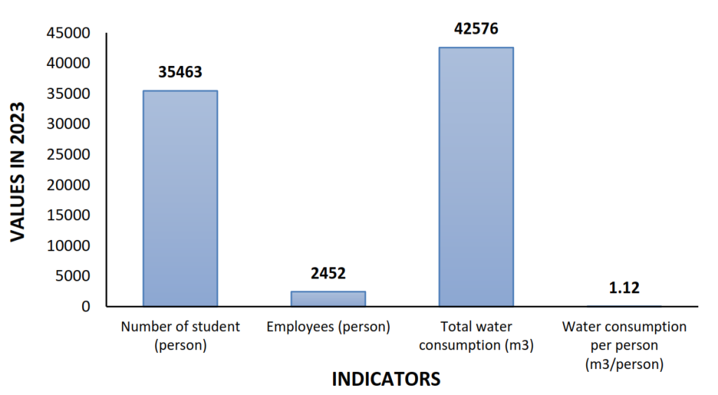 Besides having a large area, UNSRI also has a large number of students. In 2023, UNSRI has 35,463 students and 2452 employees so the total campus population is 37,915 people. With this large number, UNSRI has used 42,576 m3 of water so the total water consumption per person during 2023 is 1.12 m3/person.